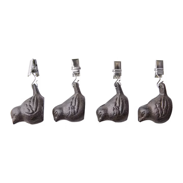 Dessa duktyngder i gjutjärn med fågelmotiv i brun nyans håller dukar och bordslöpare stadigt på plats, både praktiskt och dekorativt.