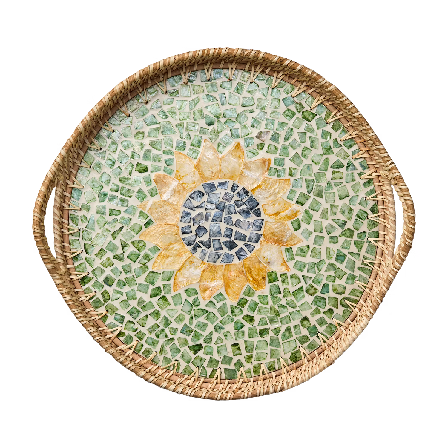 SUNNY bricka i grönt och natur med flätad rottingkant. Dekorativ och hållbar – perfekt för servering eller som en rustik detalj i hemmet.