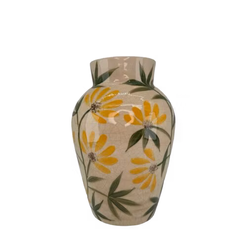 Vas med ett handmålat blommönster i gula nyanser och gröna stjälkar. Den handgjorda målningen ger en unik känsla till varje vas.
