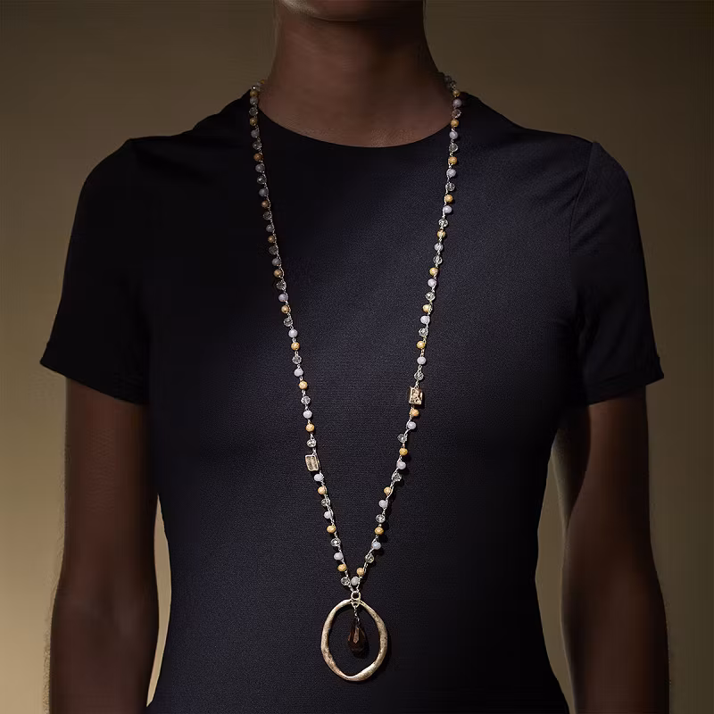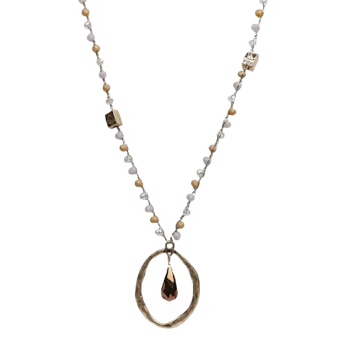 Halsband från The Moshi i en lång modell med beiga pärlor och guldfärgade detaljer.