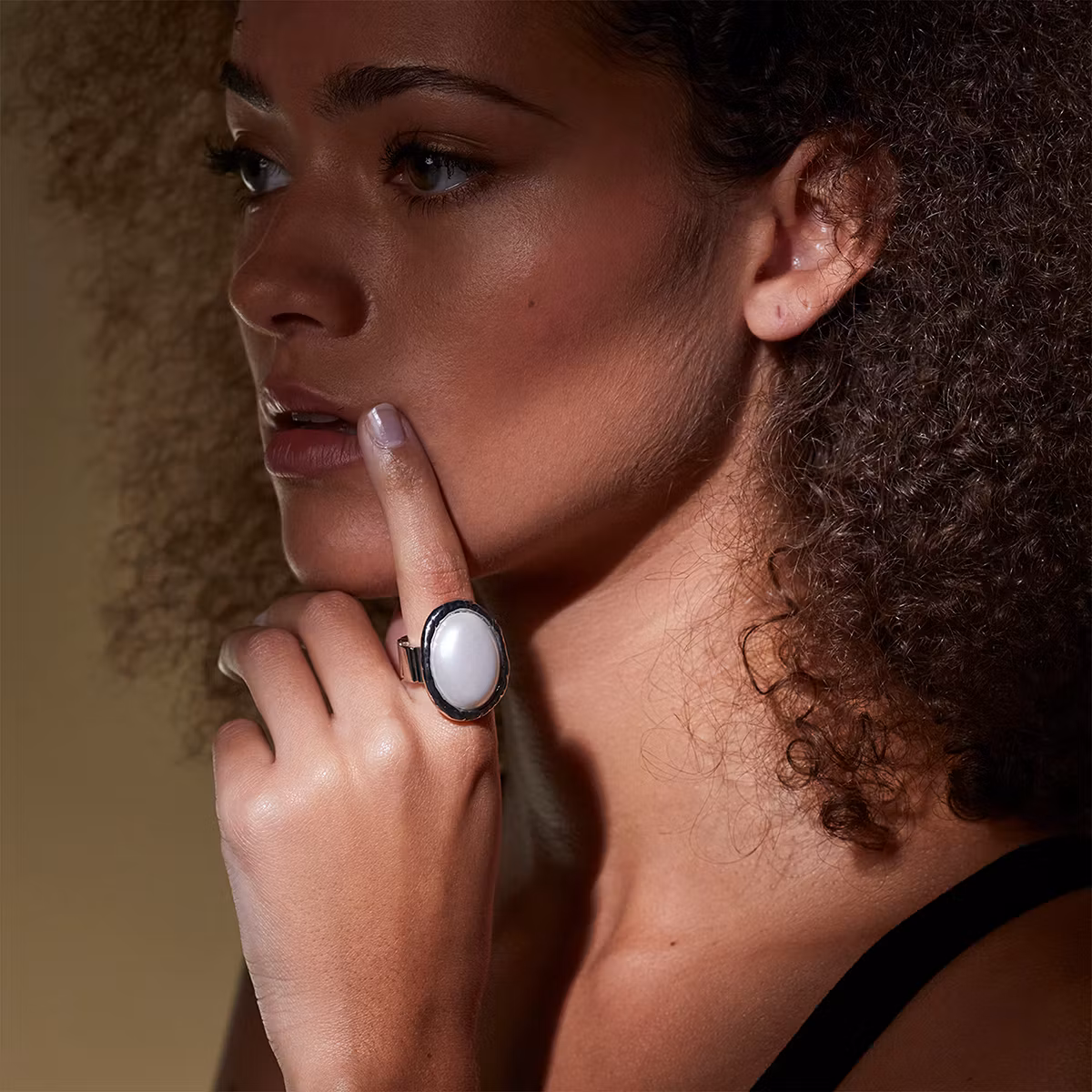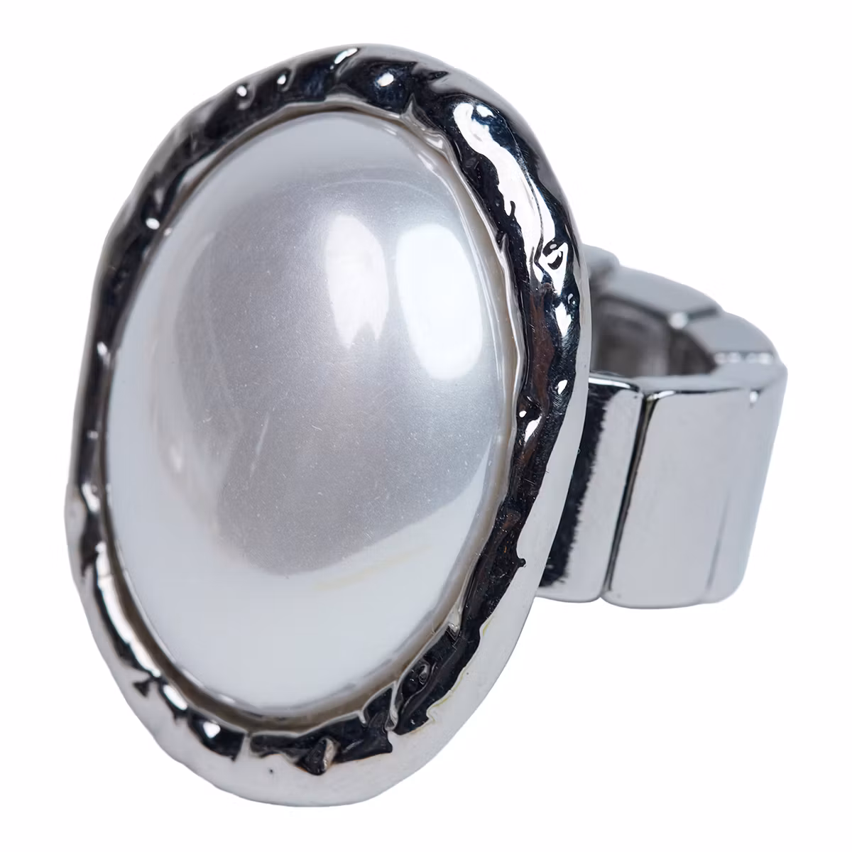 Fin silverfärgad ring från The Moshi med en stor vit sten och elastiskt band.