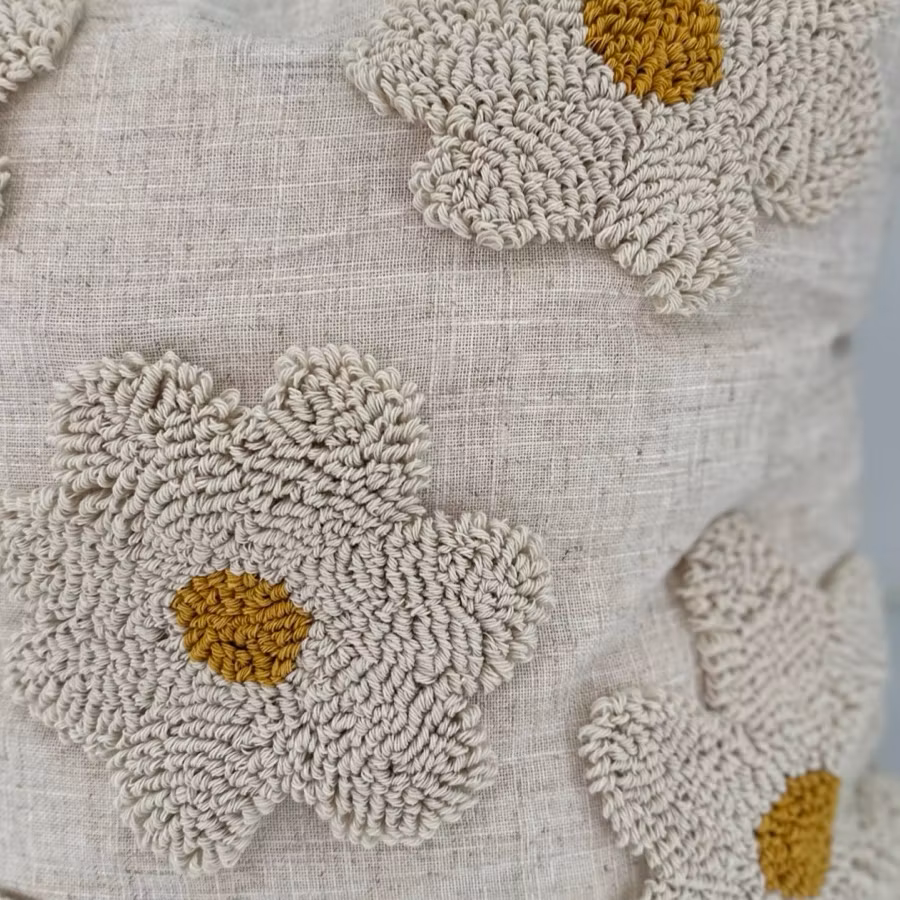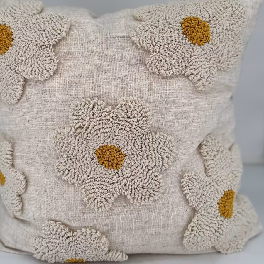 Kuddfodral från Miljögården med stora söta stickade blommor på framsidan.
